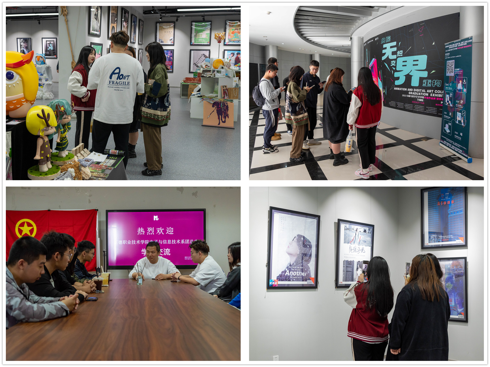 上午10点,电子与信息技术系团总支成员来到南京传媒学院,他们在动画与数字艺术学院团委老师和同学的陪同下依次参观了该院的美术馆、图书馆以及动画与数字艺术学院党团活动室。随后动画与数字艺术学院团委书记孙晨组织两方同学在党团活动室座谈。座谈会上,孙晨对电信系团总支一行表示热烈欢迎,他详细介绍了该院共青团工作开展情况,尤其是在基层组织建设方面取得的成绩。双方各部门负责人围绕组织建设、社会实践、新媒体宣传等具体工作进行深入交流探讨。