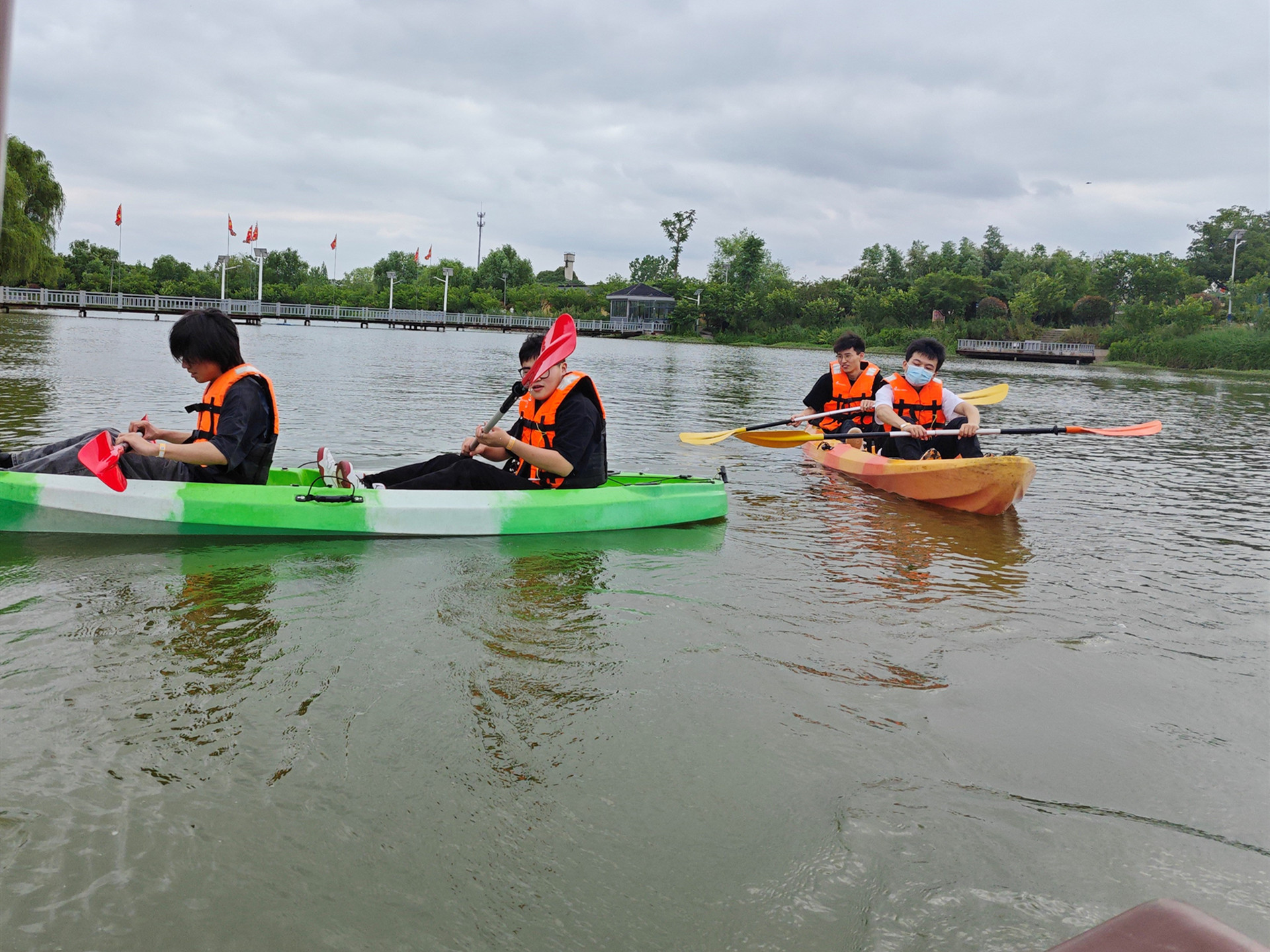 在第二轮游戏“水上碰碰船”中,同学们与队友穿上救生衣,驾驶碰碰船在水面上来回穿梭,在“进攻”与“防御”的过程中,展现出团队合作的精神。