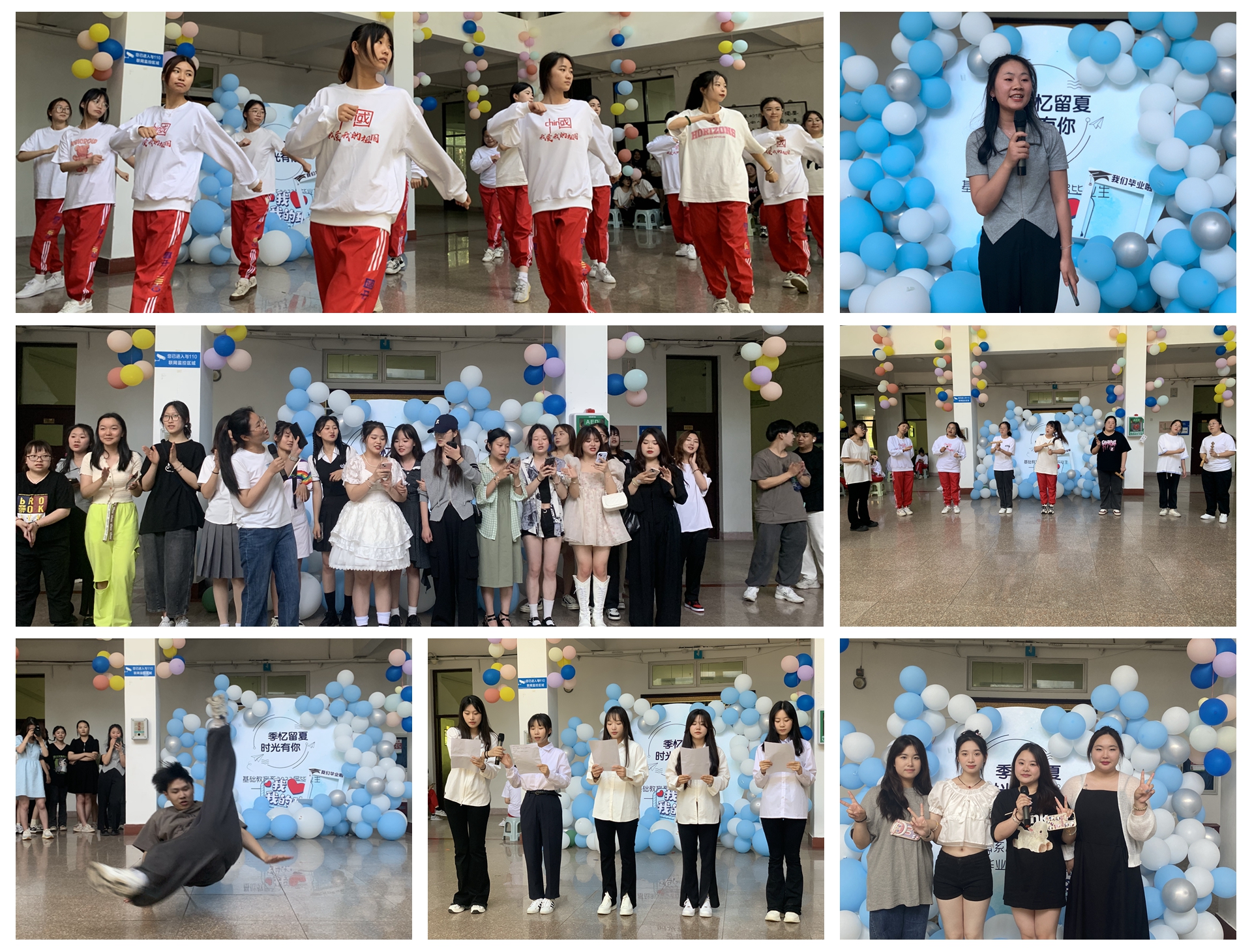 颁发完毕业证书,在9号楼的大厅里大一大二的同学们为毕业们送了一台精彩的演出。有热情似火的健身操、声情并茂的诗歌朗诵、伤感迷人的歌曲串烧、活泼可爱的奥尔夫音乐表演等,毕业班的同学们深受感动,主动上台即兴表演了舞蹈、歌曲演唱、发表感言等节目,一个个节目展现了青年学子勇于拼搏、积极向上的魅力风采,每个节目都深深牵动着在场的每一个人,现场欢呼声不断,气氛热烈,大家共同体味着浓浓的师生情谊。