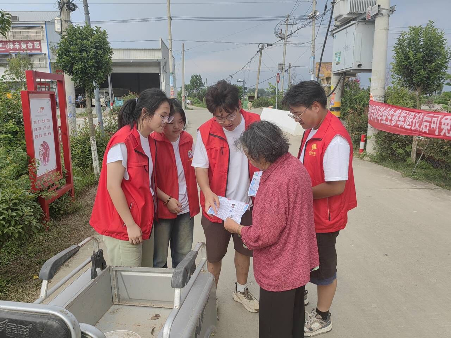 7月26日至27日,实践团跟随团队指导老师谢雅婷、王雯走进农户家中,分组向农户开展反诈、节约用水用电及普法等公益宣传,开展知识科普并分发宣传材料,进一步引导当地村民防范电信诈骗、节约用水用电等。宣传过程中,实践团成员主动帮助村民打扫小院卫生、清洗厨具等,当地村民纷纷为实践团竖起了大拇指。