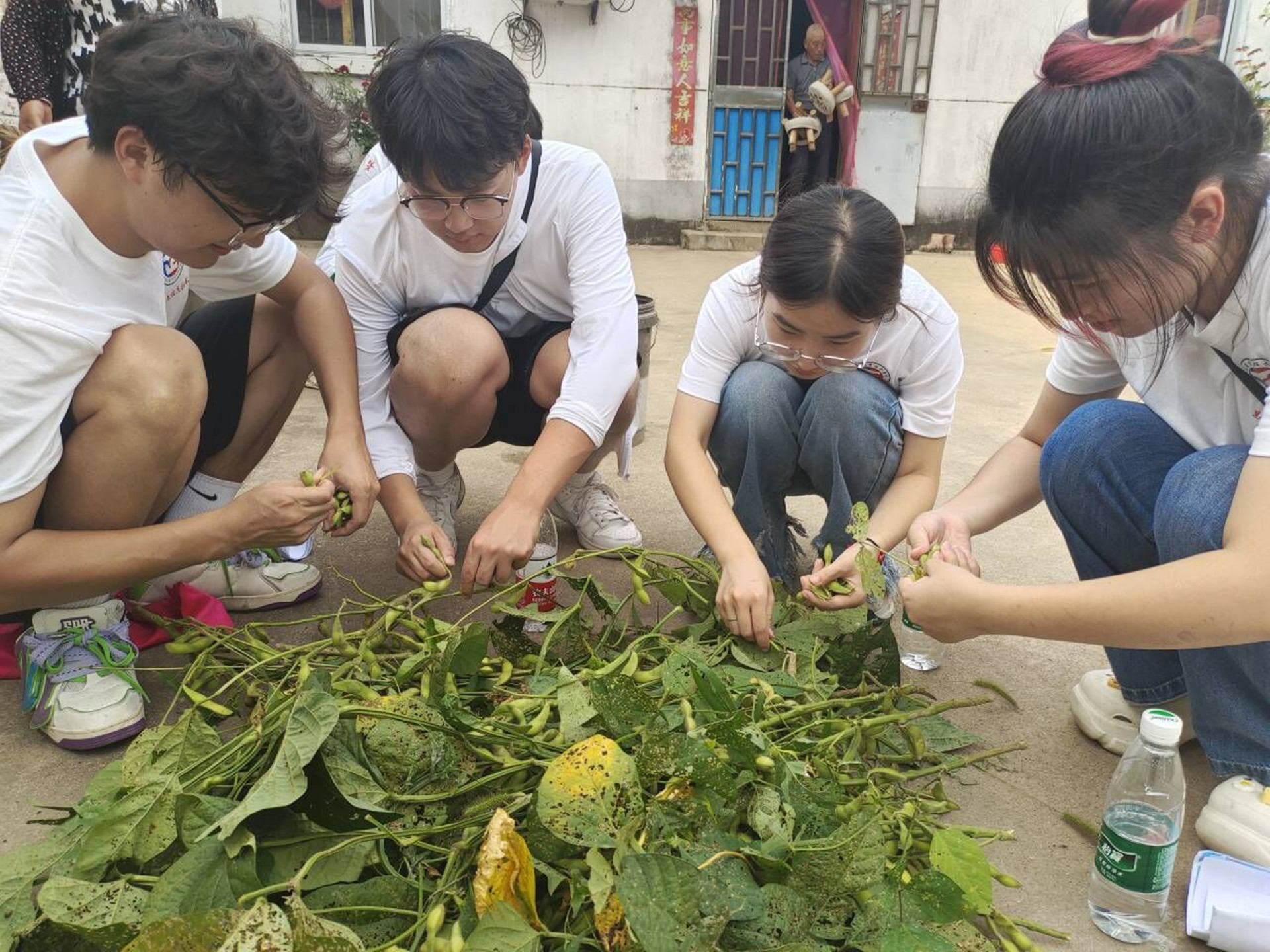 在村民的带领下,实践团走进田地间,积极帮助采摘毛豆,自告奋勇搬运稻草。阳光下,实践团成员将田间的一捧毛豆摘进手中,送入农户手心里。