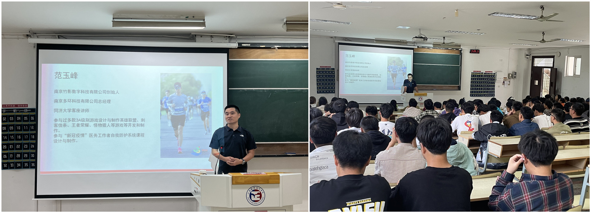 范玉峰,曾参与英雄联盟、古墓丽影、合金弹头、NBA2K、塞尔达、地平线等游戏等设计和制作以及“新冠疫情”医务工作者自我防护系统课程的开发,并受邀担任同济大学客座讲师。讲座中,范玉峰展示了英雄联盟与古墓丽影等游戏的仿真模型动画,在游戏展示的快乐氛围中,他结合“人工智能工程师”“云计算工程师”“数据分析师”等软件人才方向,将同学们的职业目标拆分成5段小目标,引导学生在行业中探索出适合自己的岗位和专业技能提升方向。
