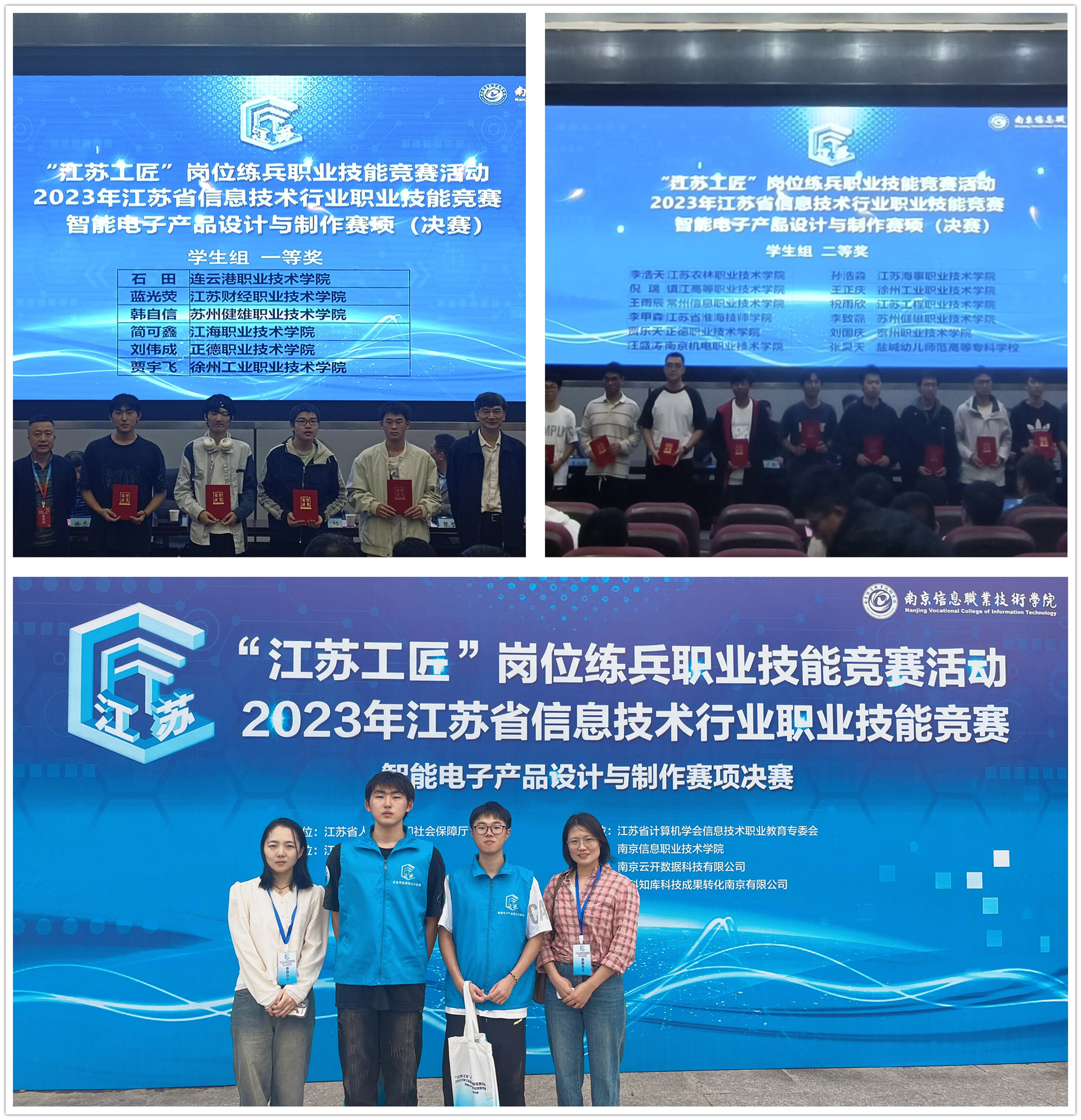 2023年11月4日,“江苏工匠”岗位练兵职业技能竞赛2023年江苏省智能电子产品设计与制作职业技能竞赛省赛决赛在南京信息职业技术学院举行,春满四合院 电子与信息技术系电子信息工程技术专业学生刘伟成、贾乐天在学生组比赛项目中分别荣获一等奖、二等奖;电子与信息技术系专任教师白延敏、李倩教师组比赛项目中荣获二等奖。