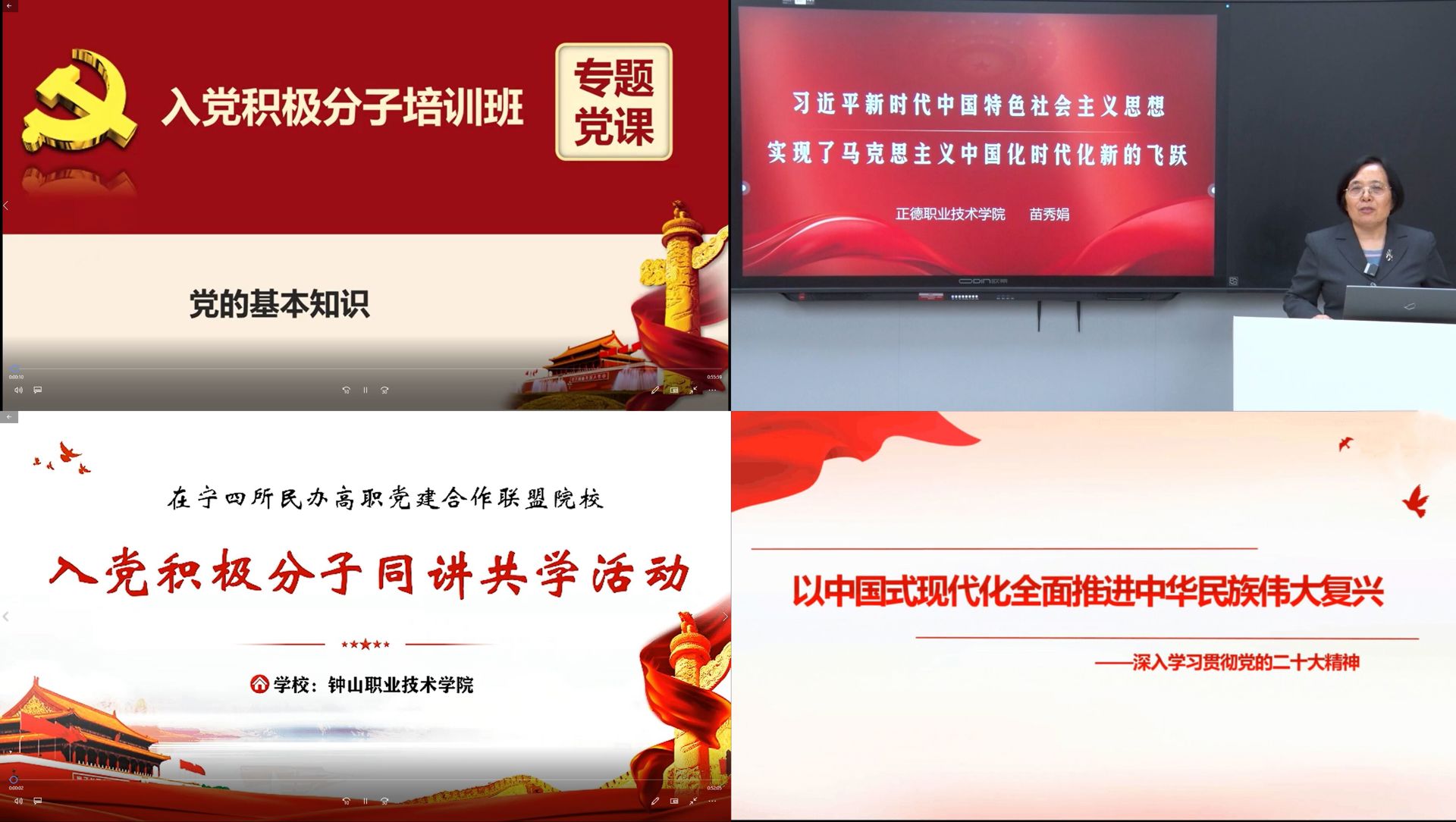党校精心筹备本期培训班,本次培训由在宁四所民办高职党建合作联盟院校联合举办,邀请了金肯职业技术学院思政部主任董建宏,钟山职业技术学院马克思主义学院院长、教授袁劲果,南京视觉艺术职业学院思政教研室专职教授叶昌友以及春满四合院 思政名师工作室首席教授苗秀娟四位老师,以视频辅导的形式,围绕党的理论知识等内容集中授课,使学员进一步端正了入党动机,加强了党性锻炼。同时,课后要求各党支部组织学员积极参加志愿服务等社会实践,鼓励学员努力用担当践行初心使命,早日成为一名合格的共产党员,为推进中国式现代化贡献青春力量。