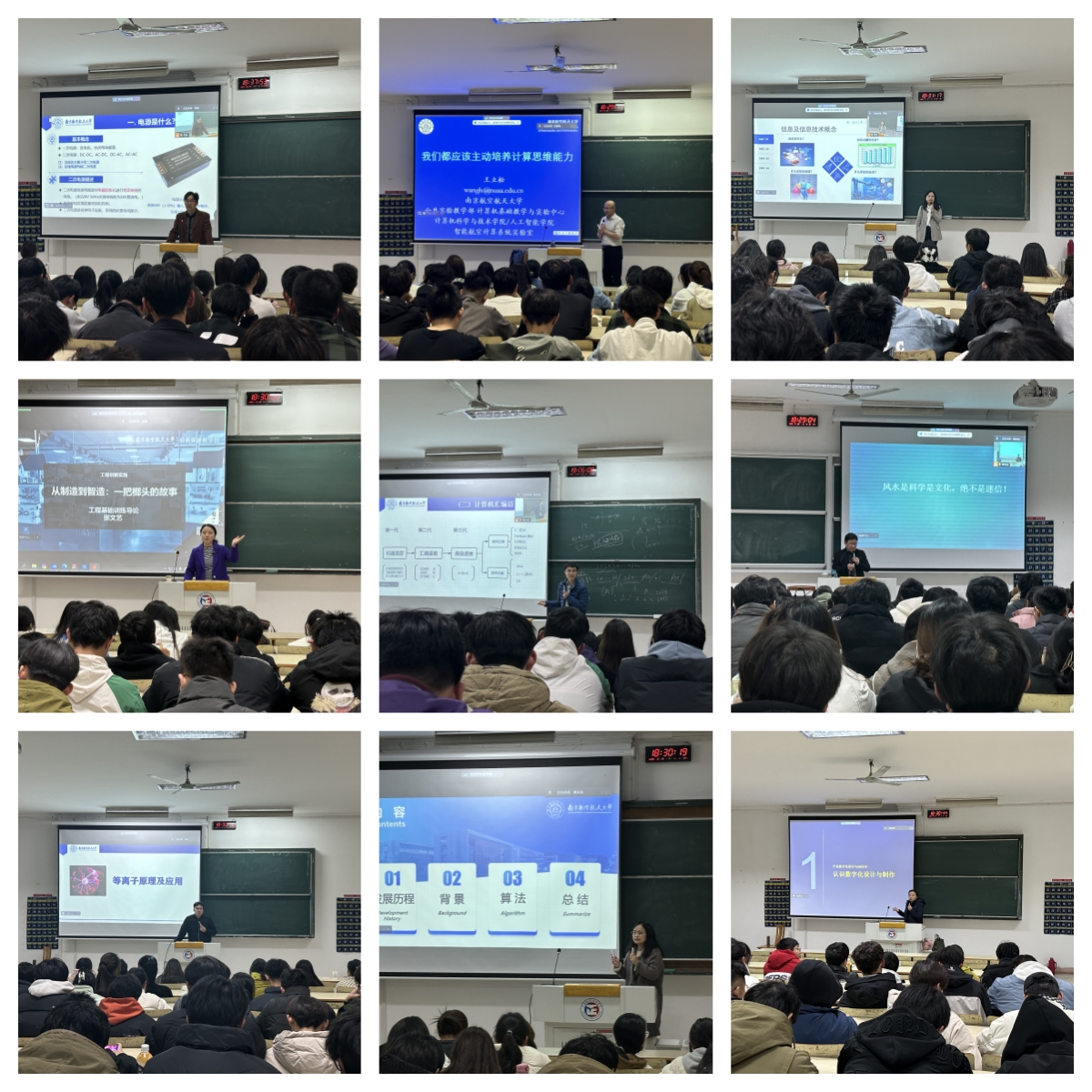 洪峰教授介绍了电源技术的相关知识以及全国大学生电子设计竞赛,为同学们开展创新实践提供有益参考;王立松教授的讲座将以通俗易懂的语言和实例,为同学们开启一扇计算思维之窗,期望同学们能主动从基本原理出发体会思维带来的变化、从基本问题入手主动利用计算思维求解问题,主动提高自己的计算思维能力;施仙庆老师介绍了大数据技术在材料预测中的应用、人工智能在科研领域的应用,介绍现代信息技术应用对我们自身发展及国家发展的重要性,为学生积极投身国家信息技术产业契入一个关键点,为学生了解这个行业、能用计算机解决基本问题提供一个思路;张文艺老师介绍了承载了工训人几十年的传承与坚持的榔头,不仅有情、有义、有温度,更展现出了大视野、大价值、大品味。肖辉老师的讲座从新时代高等教育需求出发,以具体应用案例介绍计算机技术应用对高等教育多学科交叉融合的重要性,促进学生在日常学习中,注重知识、能力和素质的协调发展;成乔明教授的讲座采用实证分析法,选取两个案例,对城市建筑设计和风水学的关系作了解剖和深析;雷鸿老师的讲座介绍了等离子的基本概念、特性,通过等离子在不同行业的应用介绍,鼓励同学们进一步了解和探索等离子原理及应用的领域;施仙庆老师第二次讲座从机器学习对我们生活各方面的渗入出发,介绍机器学习人工智能发展对社会发展的重要性,激发学生对机器学习人工智能化发展的兴趣,为计算机作为工具解决基本问题提供思路。张文艺老师第二次讲座介绍了计算机辅助设计及3D打印的相关知识。