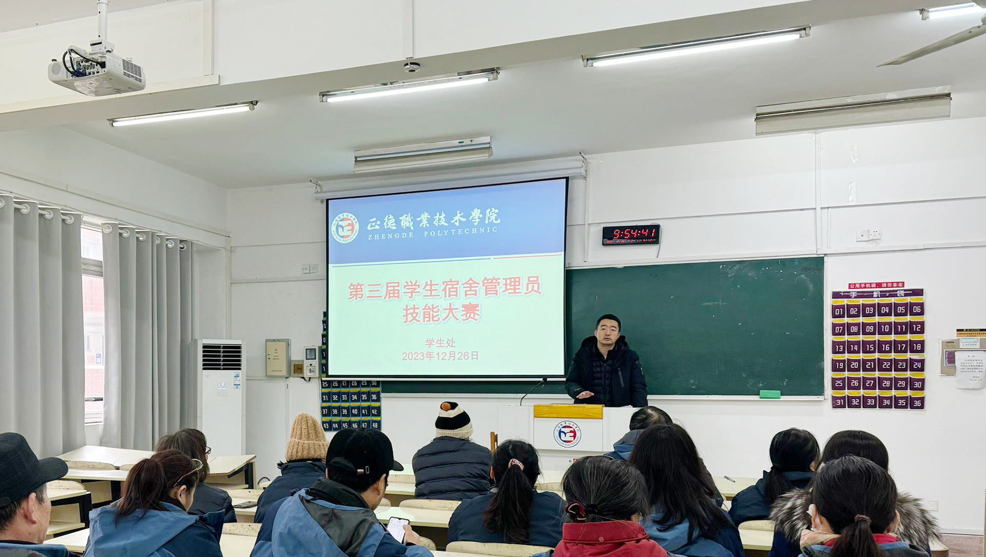 为了进一步提升学生宿舍管理员的专业技能和业务素质, 12月26日上午,学院在2206教室举行第三届学生宿舍管理员技能大赛。学生处、航宇物业、三维达物业相关负责人出席活动,学生处副处长毛茂主持比赛。