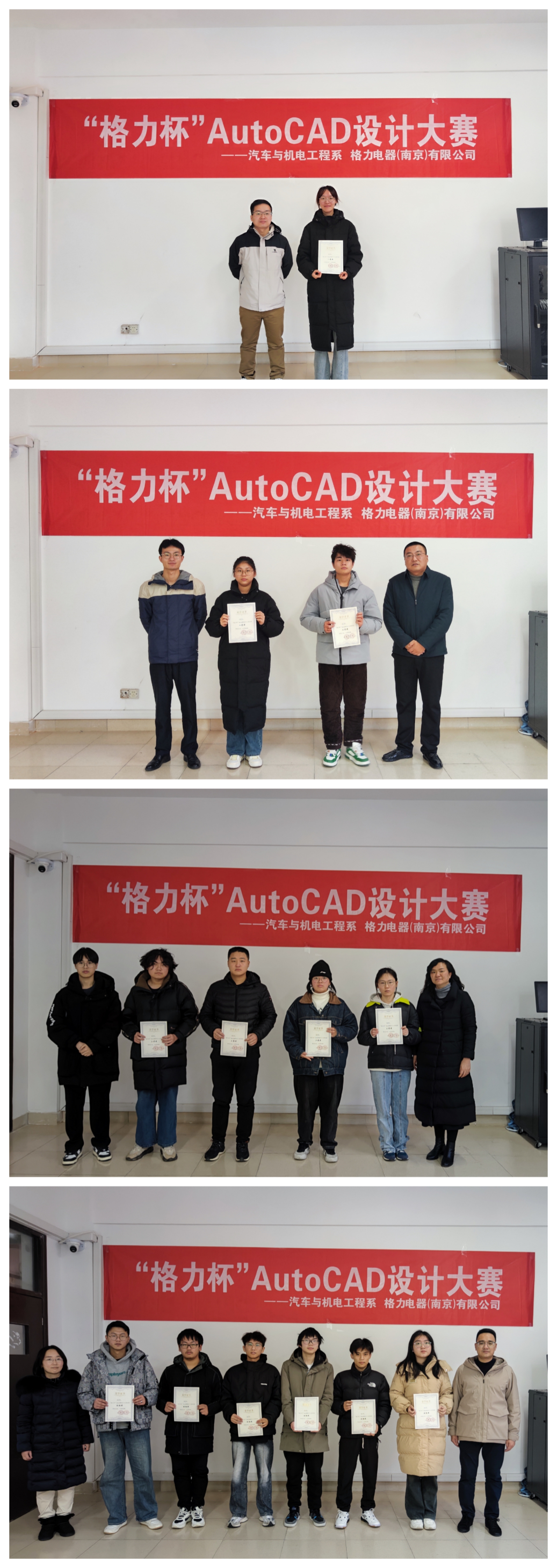 比赛现场,参赛的同学们充分展示了自己在AutoCAD制图领域的技能和才华,用实际行动诠释“技能立身,实力说话”,最终产生一等奖1名,二等奖2名,三等奖4名,优胜奖6名,系部相关领导和格力评委为获奖同学颁发证书。