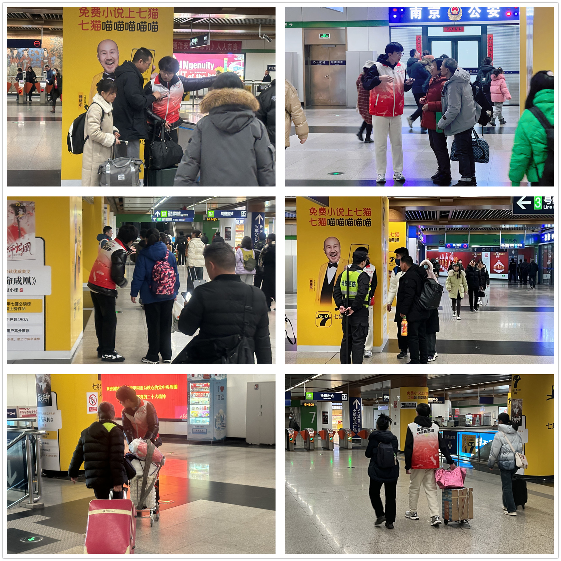 在春运期间,各地火车高铁站人流量大,很多旅客需要及时的帮助。魏宇、贡泽阳同学参与了江苏省青年志愿服务春运“暖冬行动”项目,为南京站的乘客提供服务。他们耐心倾听每一位乘客的需求,细心解答他们的问题。当乘客携带大件行李时,及时上前帮忙,用耐心和微笑做好服务,在服务群众中成长,用行动书写青春。