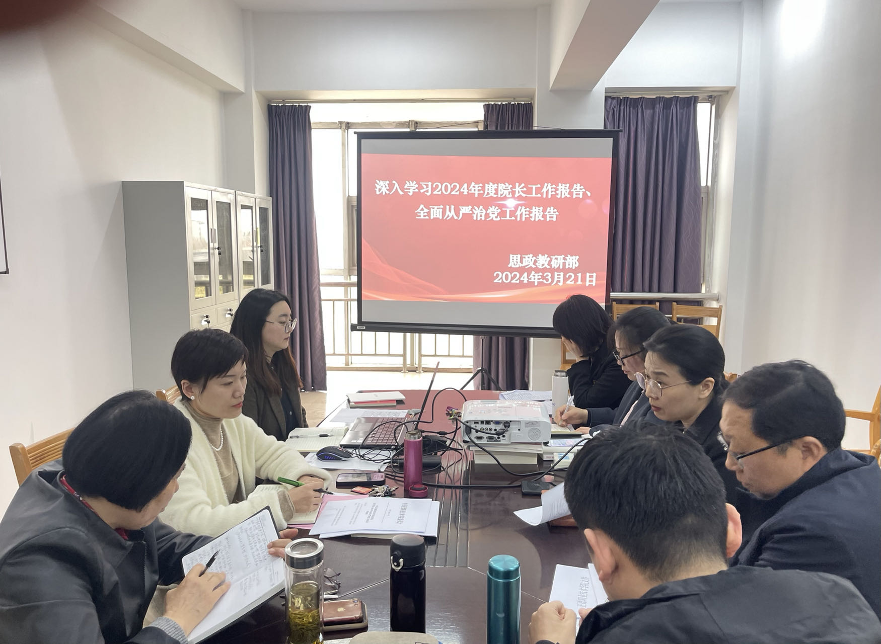 为明确新一年工作要点,明确工作思路,思政教研部于3月21日下午在名师工作室召开部门例会,深入学习了2024年度院长工作报告、全面从严治党工作报告,会议由思政教研部副主任(主持工作)李颖主持,会上全体教师积极发言并分享了个人心得。