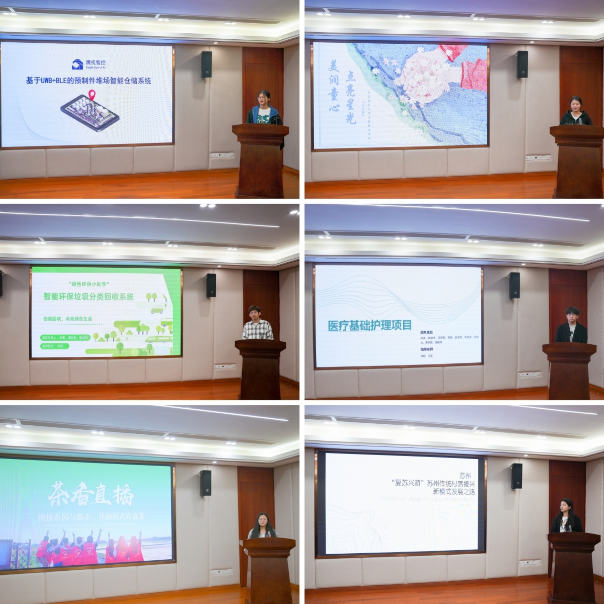 经过紧张激烈的角逐,最终6个项目作品脱颖而出,经济与管理系《基于UWB+BLE的预制件堆场智能仓储系统》项目获一等奖,基础教育系《美润童心,点亮星光》、电子与信息技术系《智能环保垃圾分类回收系统》项目获二等奖,电子与信息技术系《医疗基础护理项目》、经济与管理系《茶香直播》、艺术设计与建筑工程系《“复苏兴游”苏州传统村落振兴新模式发展之路》项目获三等奖。