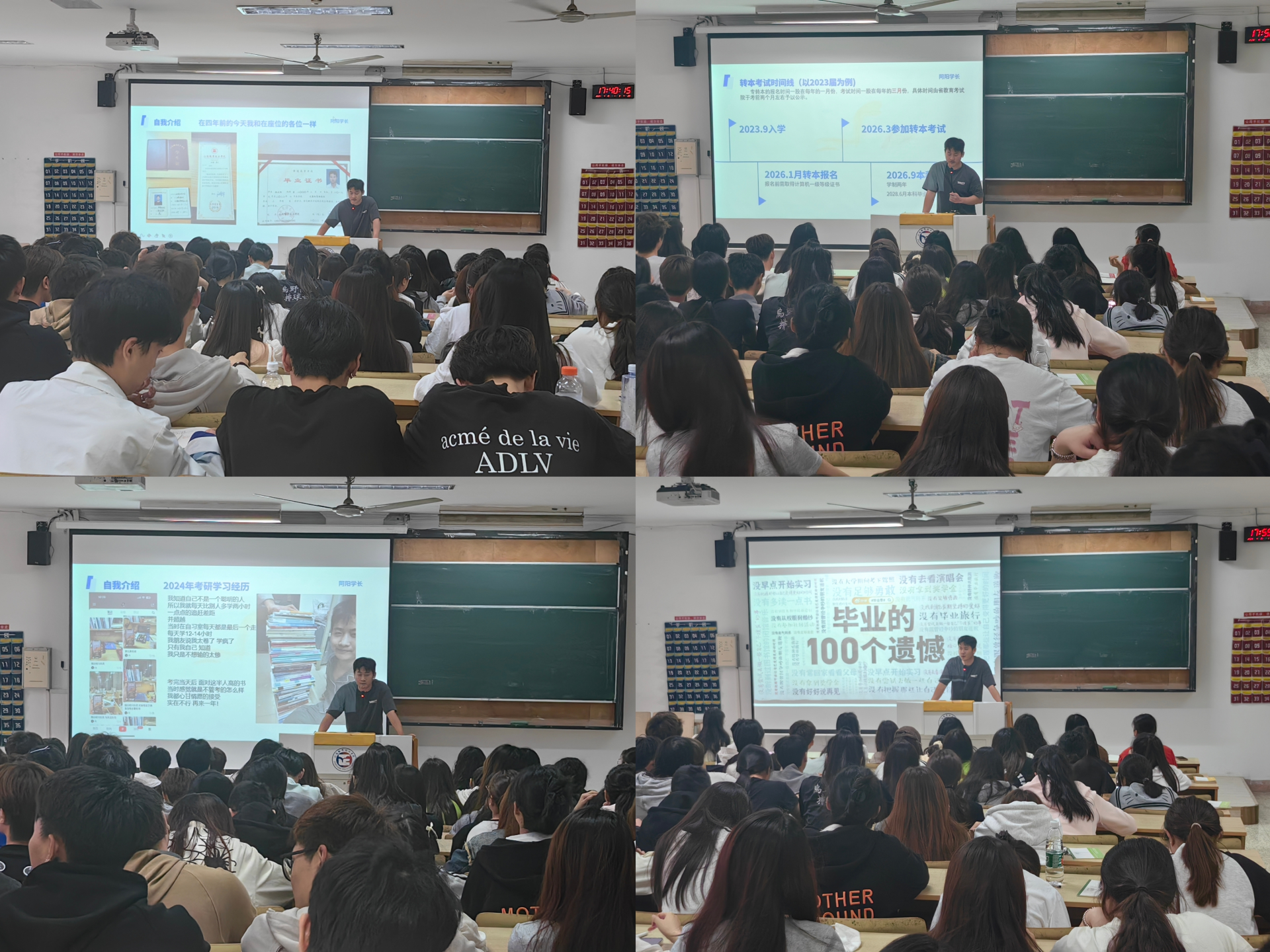 首先,在转本经历方面。他分享不仅需要努力学习、刻苦钻研,还需要给自己制定详细的复习计划,认真严格的执行。尤其是重点课程,同学们应该课前提前预习;上课时,认真听讲,不懂的地方及时向老师请教;课下利用一些手机app,再进一步巩固学习。同时为同学们厘清必考项目及各类考试的时间线,分享了自己进行时间管理的经验。生活方面,他还积极勤工俭学,发现自己的兴趣点,培养沟通技能,积累实践经验。在设定考研目标后,他对自己有清醒的定位,无论结果如何他都全力以赴,不留遗憾。