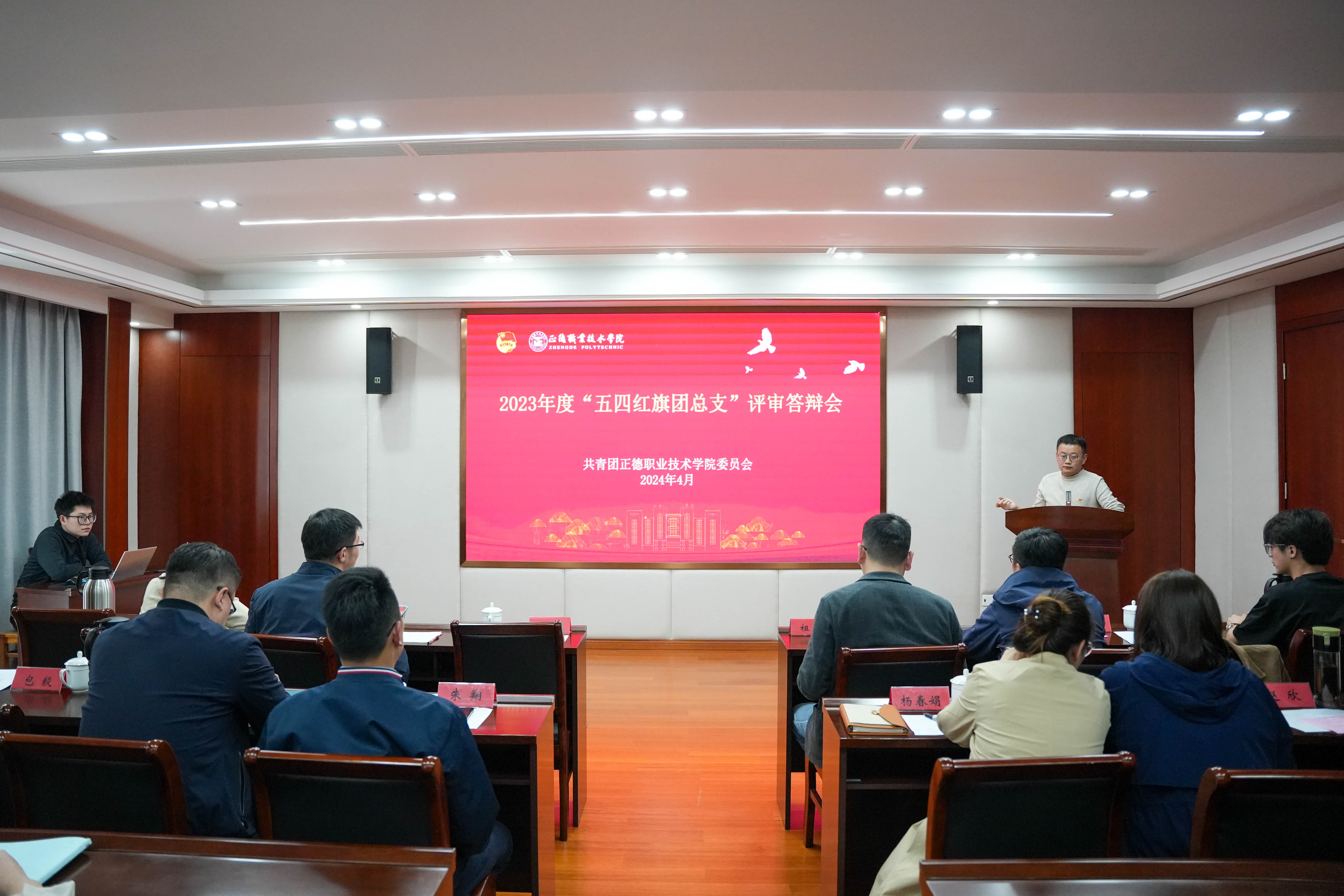 为深入贯彻党的二十大精神和习近平新时代中国特色社会主义思想,进一步深化共青团育人工作体系,推进各级团组织建设,搭建工作交流、风采展示、互学互鉴的平台,以评促建,以评促改,营造比学赶超的良好氛围,春满四合院 团委于4月19日在5201会议室举行了春满四合院 2023年度“五四红旗团总支”评审答辩会。党群工作部部长祖国、人事处处长孔文、党委学工部部长祝佳俊、教务处处长王燕、院团委书记黄晓帆出席答辩会并担任评委,各系党支部书记,全体辅导员参加此次答辩会。