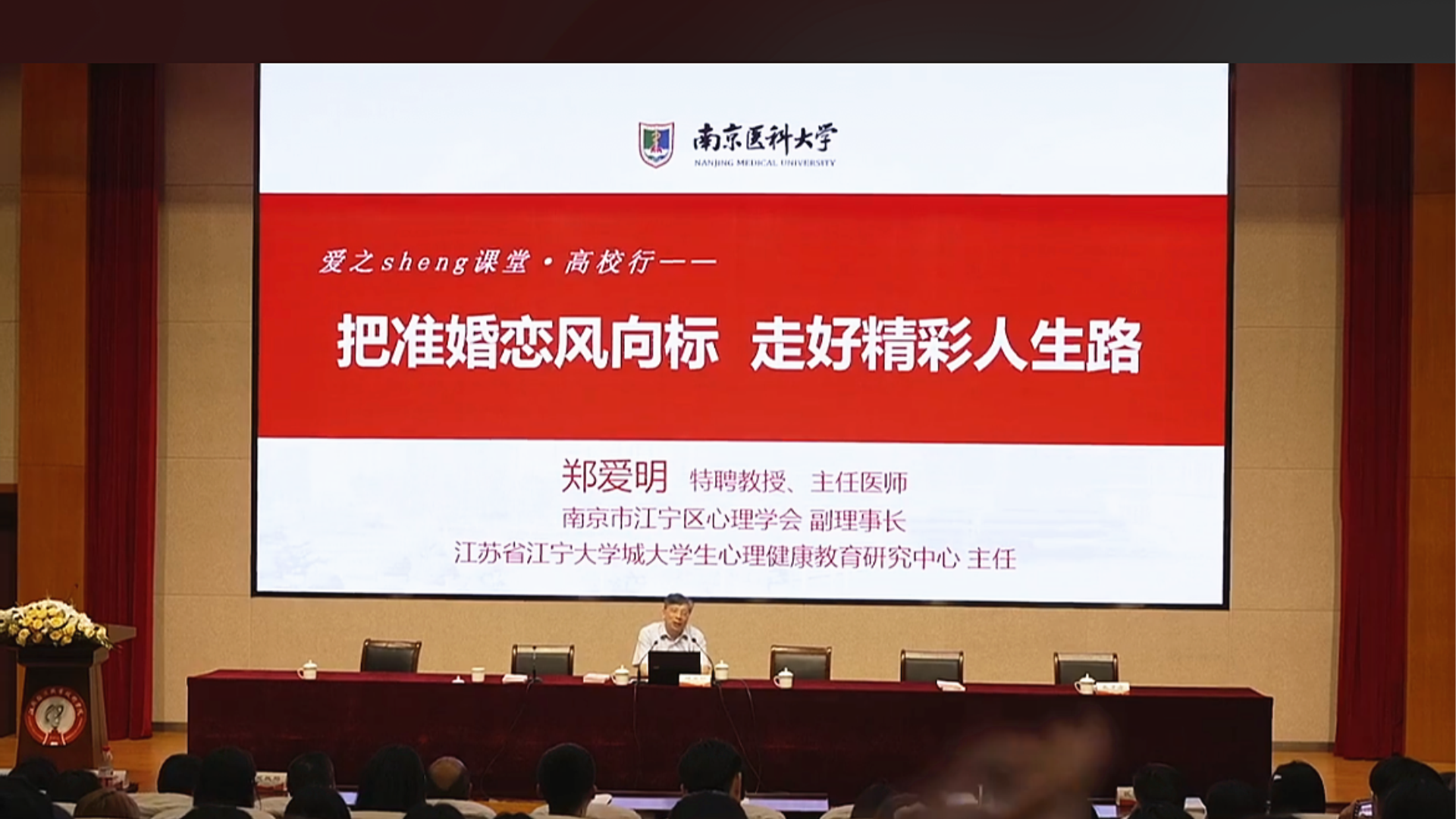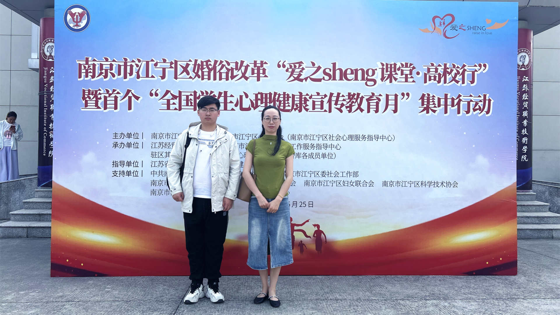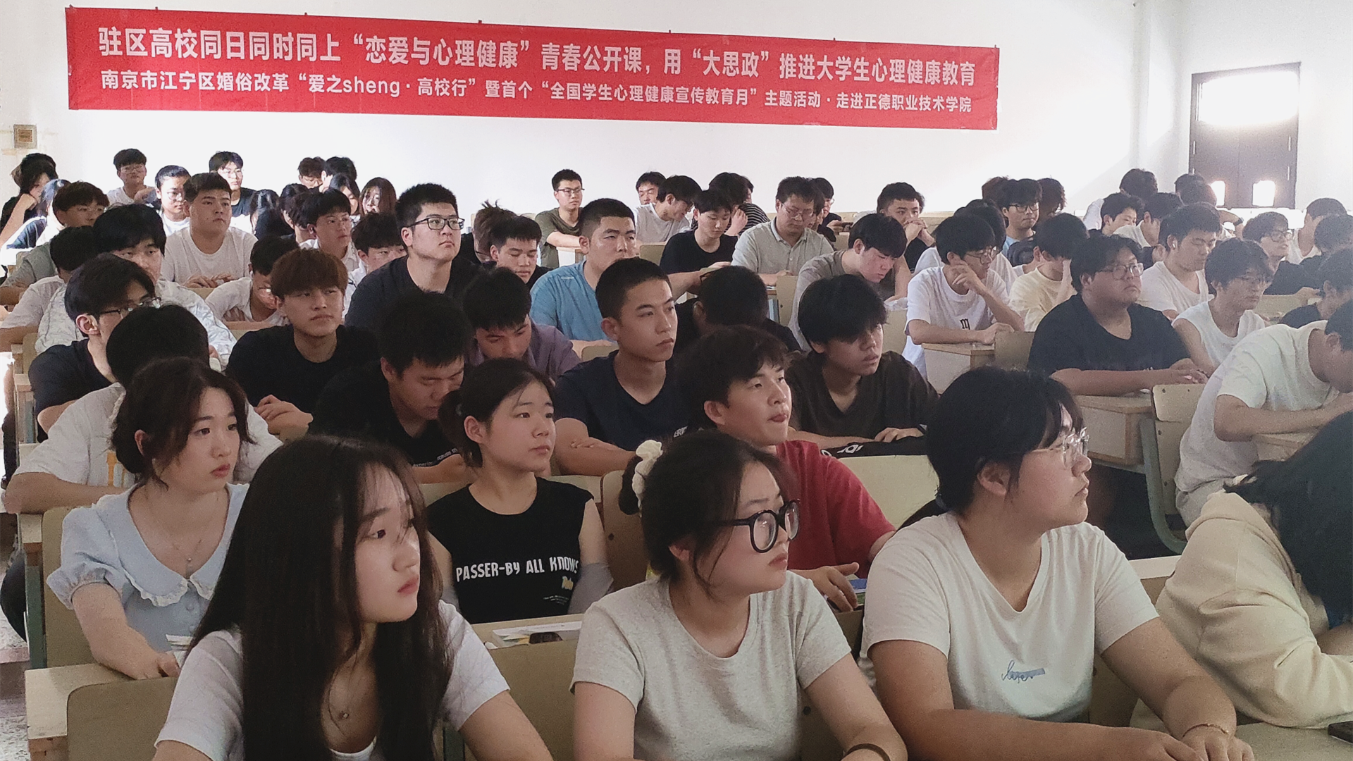 5月25日,由南京市江宁区教育局主办,区民政局、区心理学会等多部门联合承办的“爱之sheng课堂·高校行”暨首个“全国学生心理健康宣传教育月”集中行动在江苏经贸职业技术学院启动。江宁驻区27所高校21个分会场、2500余名师生,通过直播平台,线上线下同上“恋爱与心理健康”青春公开课。春满四合院 学生处傅蕴男老师和心理社团陈龙翼同学参加了主会场活动,120名学生在学院1303教室分会场观摩活动。