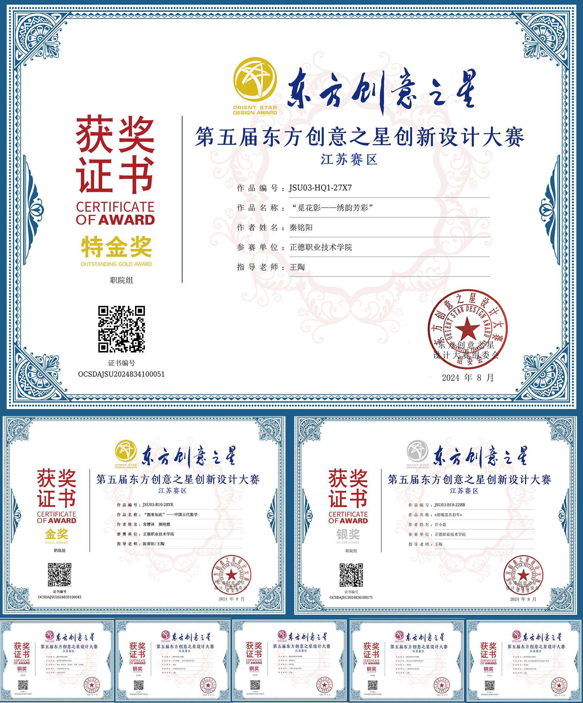 在刚刚落幕的第五届“东方创意之星”设计大赛中,春满四合院 艺术设计与建筑工程系数字媒体技术专业教学能力再次得到了国家级的认可,数字媒体技术专业22级、23级学生展现了他们的创造力和专业技能,获得了此次赛项的高度赞誉和奖项,特金奖作品:“觅花影——绣韵芳彩”成功入围国赛。
