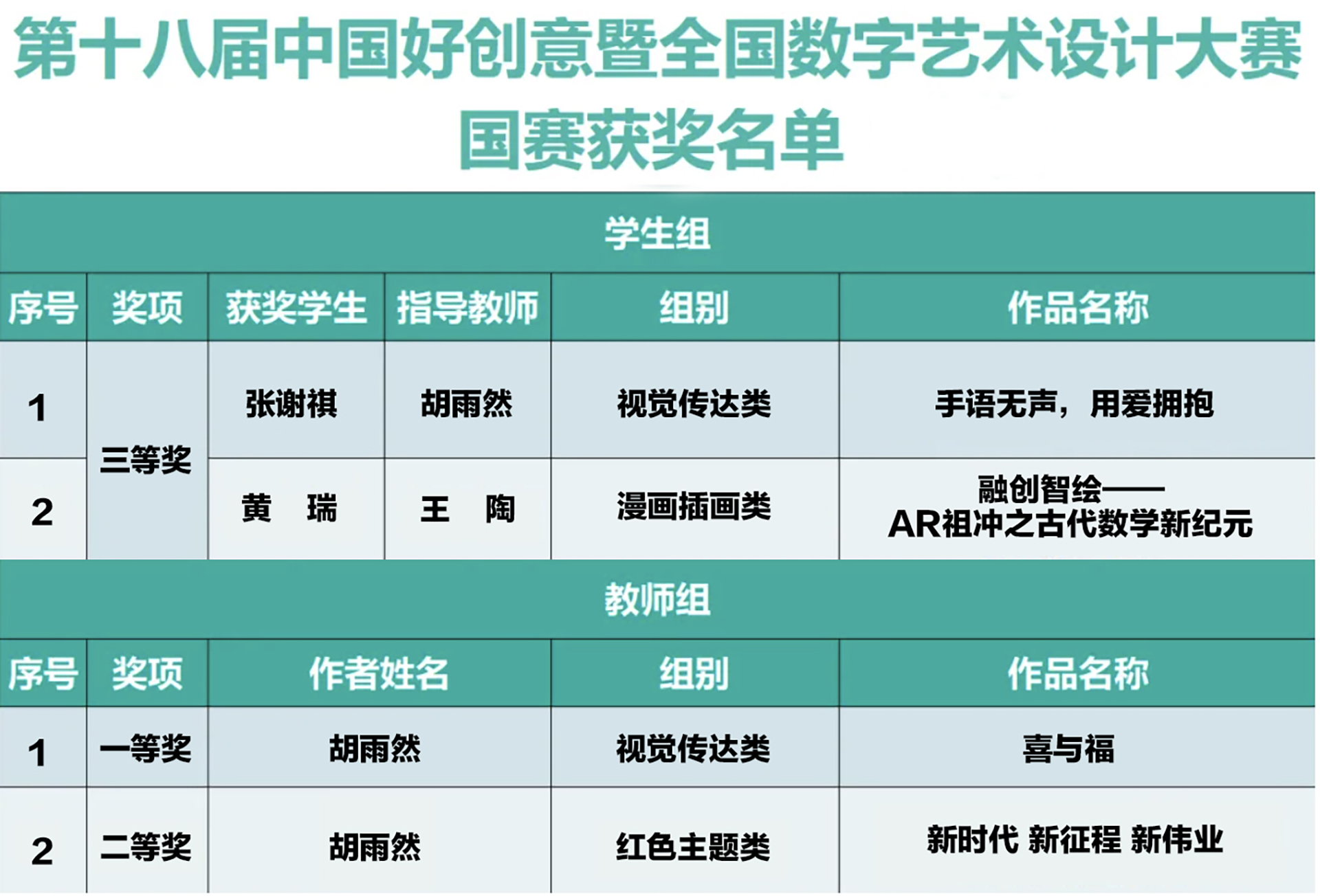 近日,第十八届中国好创意暨全国数字艺术设计大赛落下帷幕。艺术设计与建筑工程系师生荣获国家级一等奖1项、二等奖1项、三等奖2项,省级优秀奖1项,获奖数量创历史新高!胡雨然、王陶两位老师荣获了优秀指导教师奖。这一系列佳绩不仅彰显了我系在数字媒体技术领域的雄厚实力,也为学生和教师们的辛勤付出和才华展现画上了浓墨重彩的一笔。