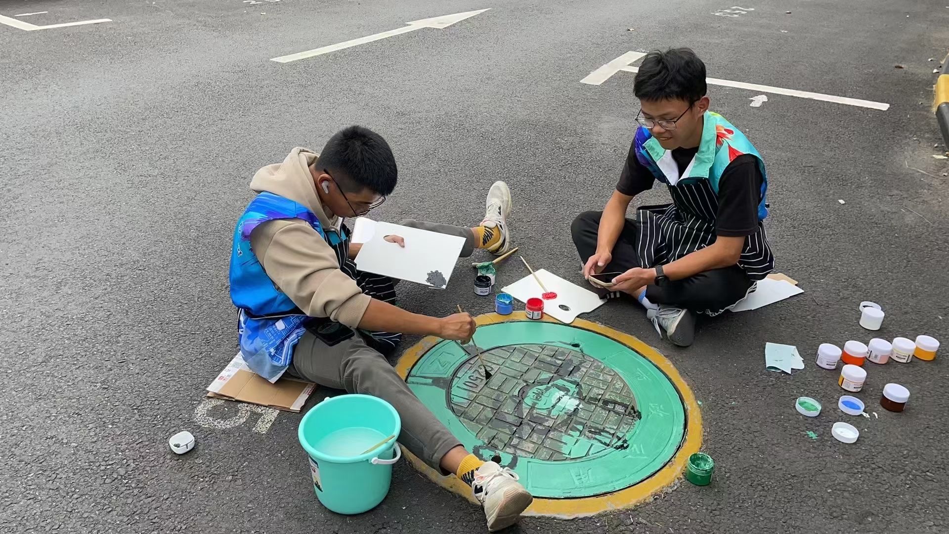 暑期社会实践团队前往骆村,开启了“井上添花”的井盖绘画活动。队员们按计划分成若干小组,蹲在井盖旁,以井盖为画板,认真勾画轮廓、上色、涂漆,将原本冷冰冰、千篇一律的灰暗井盖变成了色彩斑斓的 " 景 " 盖,在美化园所环境的同时也展现了当代大学生志愿服务基层,勇于奉献担当的时代精神。