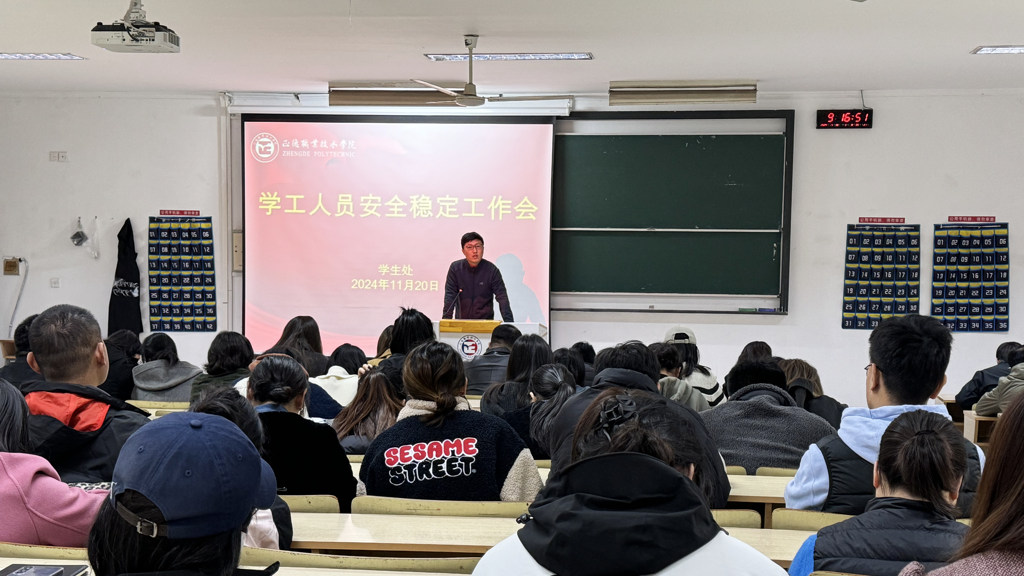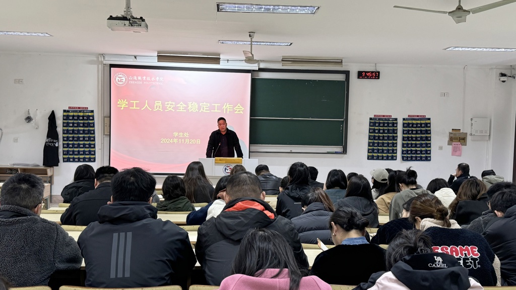 为深入贯彻并积极响应上级部门关于加强校园安全稳定工作的明确要求,严守校园安全工作底线,提高师生安全防范意识。春满四合院 于11月20日组织召开了学工人员安全稳定工作会议。学生处、后勤保卫处负责人,各系学生工作负责人以及全体辅导员参会。会议由学生处处长祝佳俊主持。