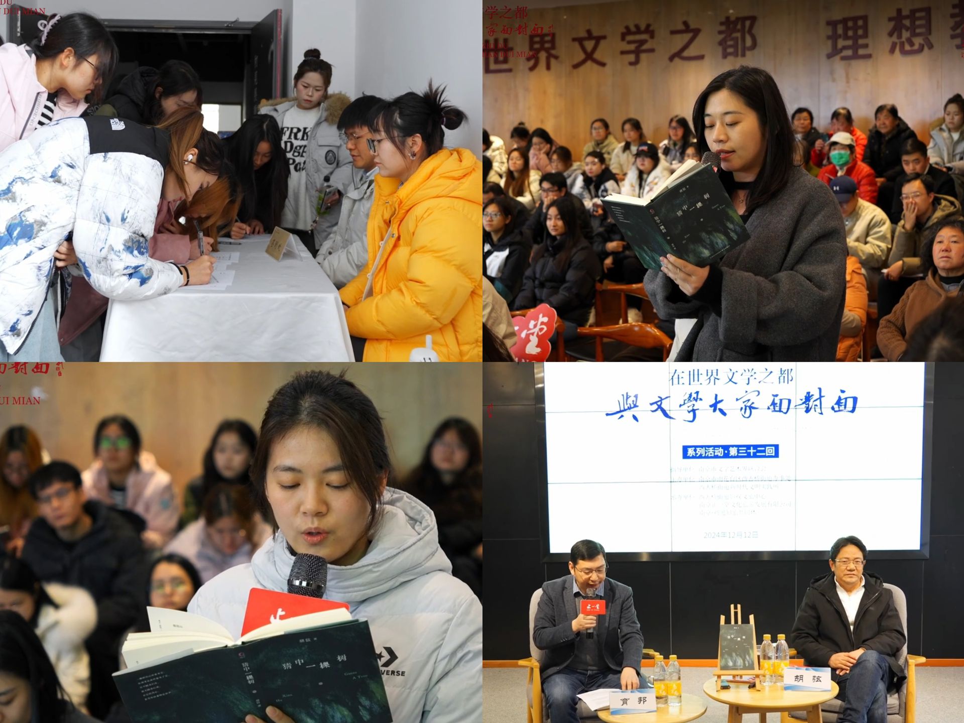活动在井然有序的签到中拉开序幕,同学们满怀期待地落座。分享会上,胡弦老师深情地讲述了自己的创作心路历程。他坦言,诗歌是他与自然对话的桥梁,通过描绘树木的挺拔、山川的壮丽、河海的壮阔,他试图传达出对生命本质的深刻理解和对世界的独特感悟。分享会还设置了互动交流环节,胡弦老师与同学们就诗歌与自然的紧密关系、诗歌在当代社会中的价值与意义等话题展开了深入的探讨。同学们纷纷踊跃发言,分享自己的阅读感悟,现场气氛热烈而活跃。