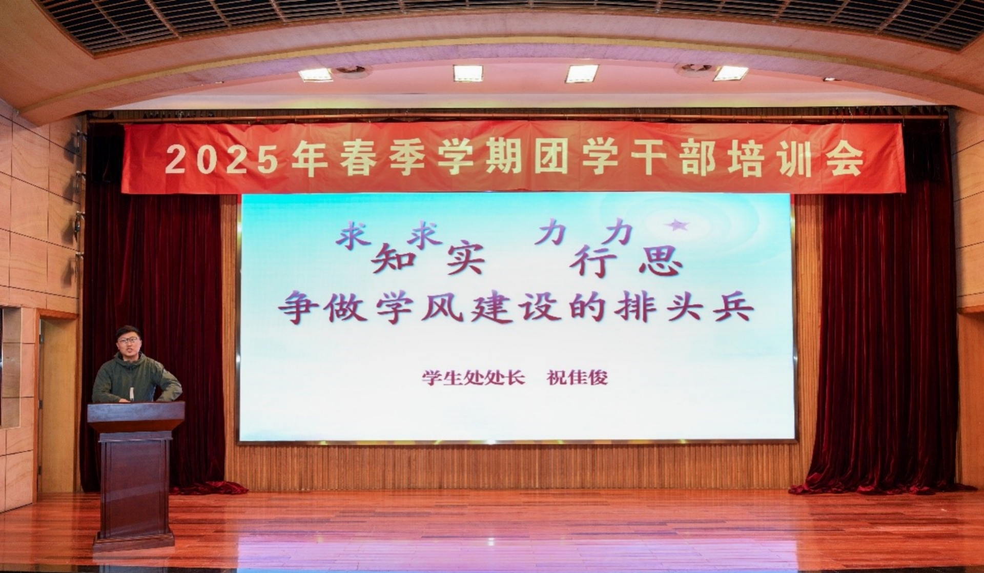 祝佳俊以《“求知求实,力行力思”——争做学风建设的排头兵》为题,为团学干部们上了一堂生动的思政课。他指出,团学干部作为学生的优秀代表,应该以身作则,模范践行“敏于行、勤于思”的学风,积极参与学风建设活动,争做学风建设的排头兵。他还就如何提升团学干部的组织能力和服务意识提出了具体要求,鼓励大家以实际行动践行责任与担当,为学风建设贡献力量。