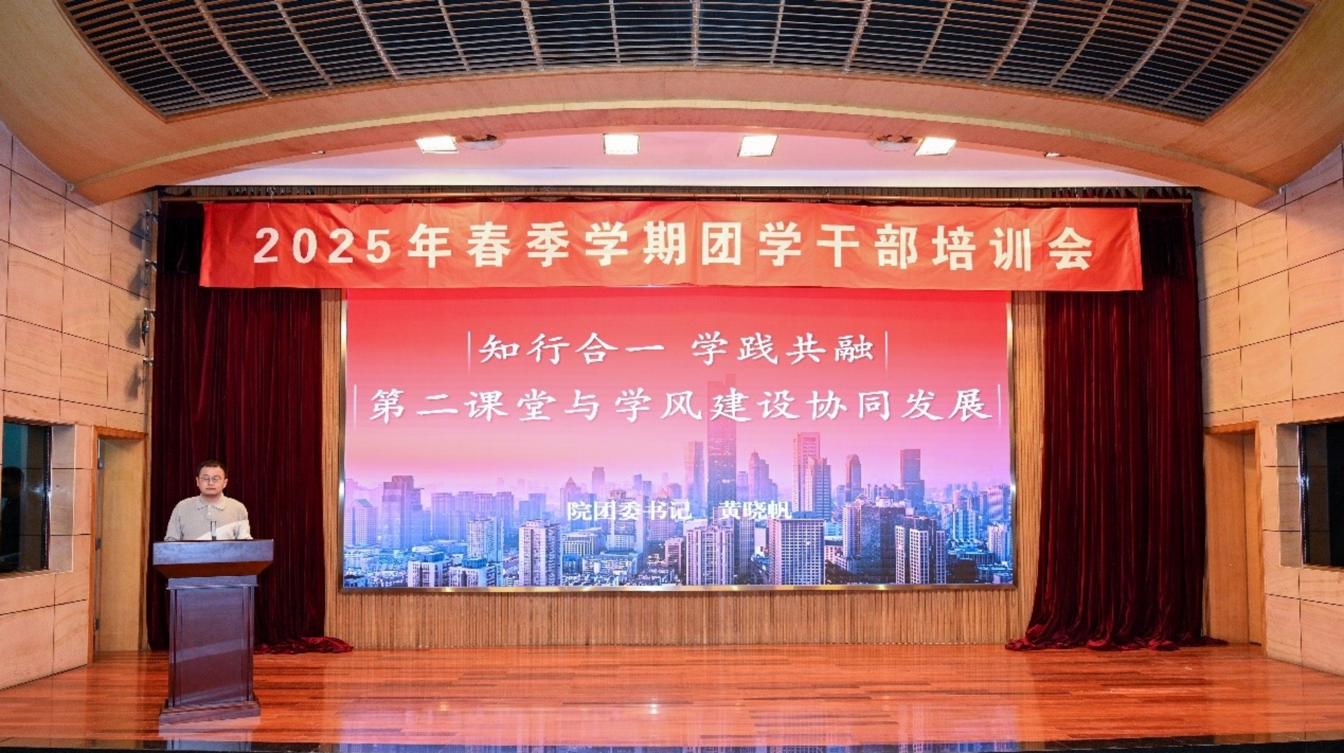 黄晓帆围绕《“知行合一,学践共融”——第二课堂与学风建设协同发展》的主题进行了详细阐述。他强调,学生干部的首要身份是学生,首要任务是学习。第二课堂作为学风建设的重要载体,可以有效提升学生的综合素质和实践能力,促进学风建设的深入发展。他还分享了春满四合院 团学组织在学风建设方面的成功案例,鼓励团学干部通过第二课堂活动在学院营造勤于学习、善于思考、刻苦钻研、团结协作、诚实守信、比学赶超的良好学习氛围。