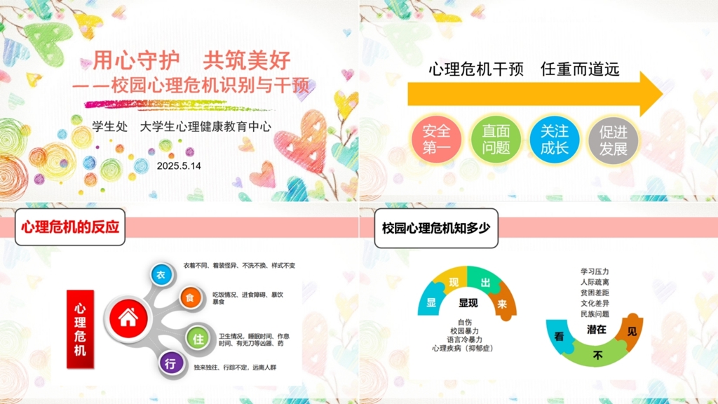 为进一步提升宿管员对学生心理危机的识别与干预能力,筑牢校园心理健康防线,5月14日上午,学生处大学生心理健康教育中心在2207会议室举办了“校园心理危机识别与干预”专题培训会。本次培训会由心理中心教师樊荣主讲,学生处副处长何华智主持会议并作总结讲话,心理中心教师宗佳及全体宿管员参加了本次培训会。
