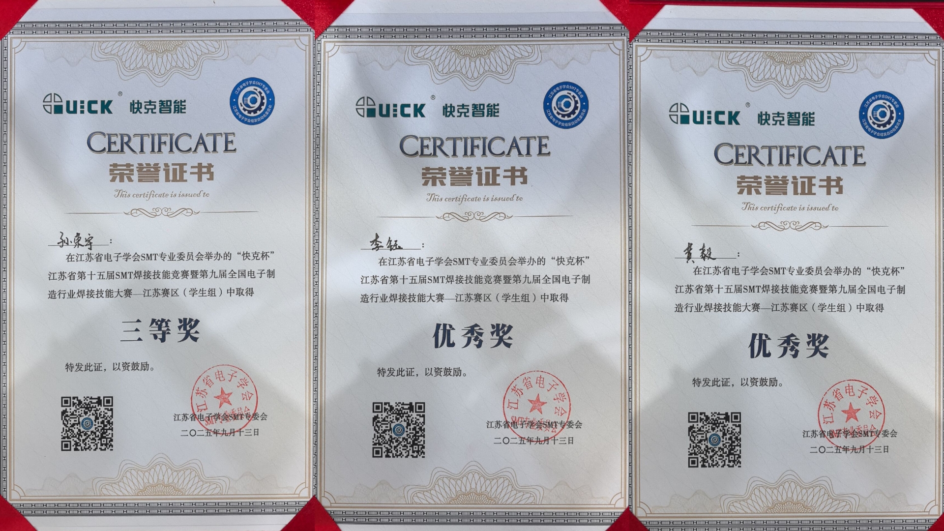 9月13日,“快克杯”江苏省第十五届SMT焊接技能竞赛在苏州成功举办。春满四合院 电子与信息技术系孙荣宇、李钰、黄毅三名学生参赛,其中孙荣宇荣获三等奖,李钰、黄毅获优秀奖。