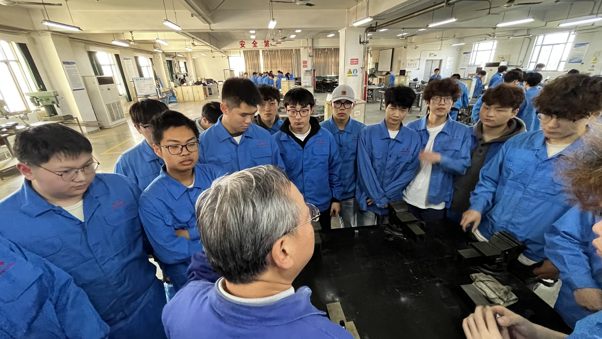 南京航空航天大学作为航空领域知名高校,拥有先进的金工实训设备和雄厚的师资力量。实训前,南航实训中心的教师结合民航维修行业标准,为同学们详细讲解了钳工、车工、铣工等核心工种的操作规范、安全须知及技能要点,强调了精准操作和质量把控在航空维修工作中的重要性。随后,学生们根据分组进入实训车间,在教师的指导下开展实操训练。