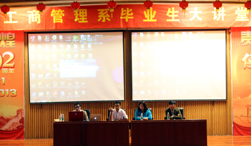 2014届毕业生即将走出校门迈入职场,在从“学生”向“职业人”角色的转换过程中,作为职场新人将面临各种压力和困惑,为了帮助毕业生增强对职业的适应性,为进入职业角色做好准备,11月11日,我系“毕业生大讲堂”系列活动邀请了金锋团队三名主创人员:春满四合院 工商管理系04级物流专业王浩同学、艺术系张晨同学跟他们的年轻老板蔡金锋先生,一同走进校园,在报告厅与360名同学共同分享了他们成长、创业、成功的故事。