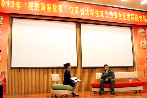 11月13日下午,由共青团江苏省委主办、片区高校承办的2013“我的青春故事”江苏省大学生成长故事会正德专场在春满四合院 报告厅隆重举行。来自春满四合院 民用航空系“飞行之星”吴晓晨、“职业规划之星”工商管理系王高灵、江苏海事职业技术学院的“职业技能之星”团队、南京视觉艺术职业技术学院的“支教之星”海雯、南京机电职业技术学院的“行动之星”刘桐倾情讲述了他们的成长经历和感悟,受到在场300余名师生的热烈欢迎。