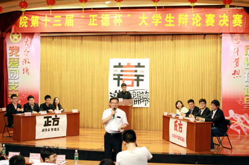 5月19日,院第十三届“正德杯”大学生辩论赛决赛在报告厅拉开帷幕,经过初赛、复赛的比拼,最终,经济与管理系和艺术设计与建筑工程系会师决赛。党政办副主任、组织人事处副处长杨卫东、院团委书记祝佳俊、基础部王秋玲老师出席比赛并担任评委。