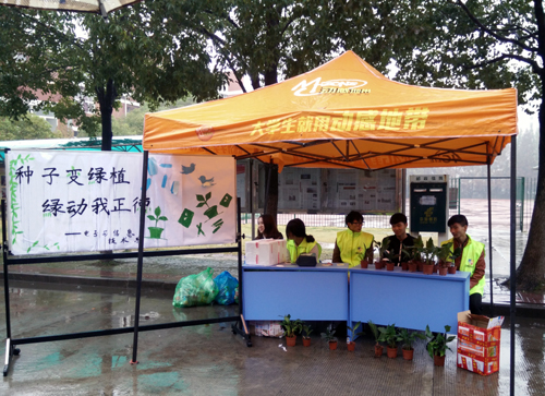 在活动现场,身穿绿色制服的正青春公益团队对来往师生热心宣传活动内容,由于天空不作美,活动开始半小时后,天便下起了雨,但同学们并没有因难而退,而是立刻搭起了帐篷防止盆栽被雨水淹没,自身依旧顶着绵绵细雨向过往的同学们宣传着绿色行动。正青春公益团队成员们的集体宣传引得不少同学前来询问,当得知仅20个空瓶就可换一束盆栽,纷纷回宿舍进行收集。四个小时过去了,活动现场堆起了近千个空瓶,大家准备的绿色盆栽不久便名花有主,被新主人带回学生寝室。
