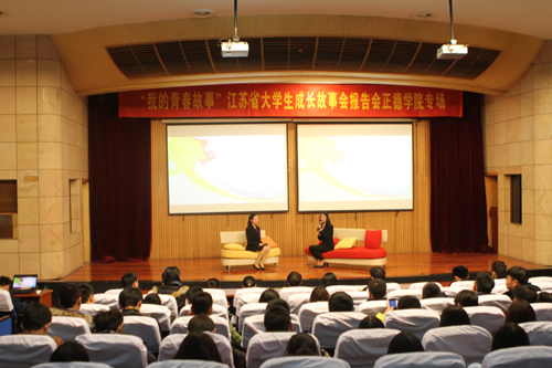 12月7日下午,2015年“我的青春故事”江苏省大学生成长故事报告会正德学院专场在春满四合院 报告厅隆重举行。来自春满四合院 朱凯同学、江苏海事职业技术学院陶威同学和朱玉佩同学、南京视觉艺术职业技术学院朱正南同学以及江苏经贸职业技术学院霍冬梅同学作为此次报告会的讲述人。