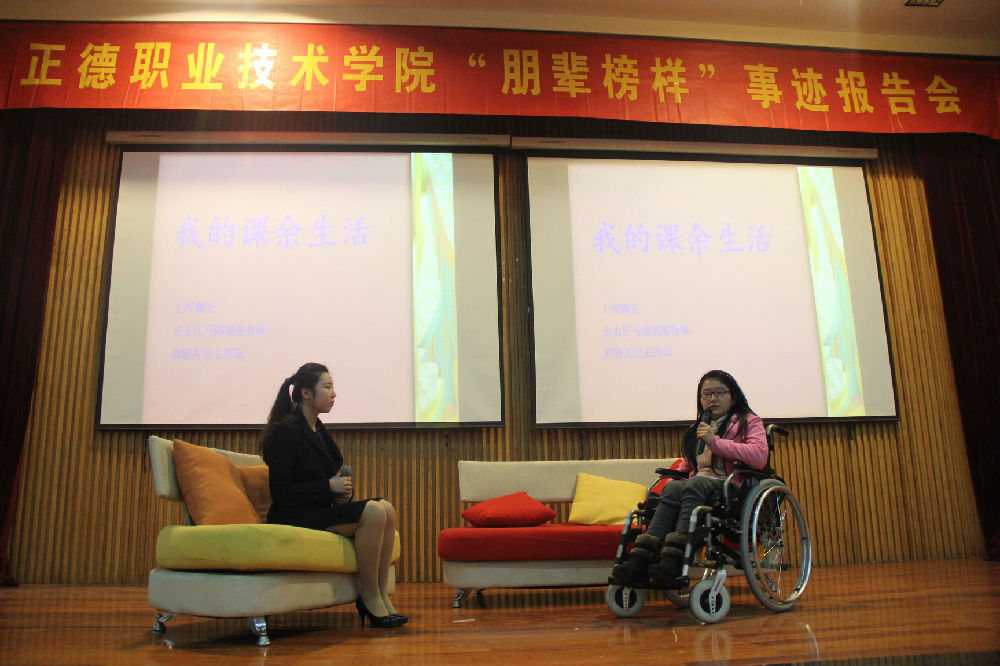 “实践标兵”——经济与管理系2013级营销专业石建永同学与大家分享了他的学生干部工作体会、敬老院志愿服务经历、实习感悟等;2014级会计与审计专业的残疾学生肖荷花同学用自己的切身经历告诉同学们要珍惜当前美好的大学时光,好好学习、勇于拼搏,在面对困难面前,永不言弃。艺术设计与建筑工程系的高沛君同学向大家讲述了自己参加省大学生职业规划大赛获得“职业规划之星”的心路历程;民用航空系“志愿标兵”朱柏宇同学讲述了自己在校三年参与各类志愿服务活动的心得体会,作为2015年春满四合院 赴台交流学习并且获得侨光科技大学“学习楷模奖”的优秀学生,朱柏宇还详细介绍了自己四个多月的台湾学历历程。