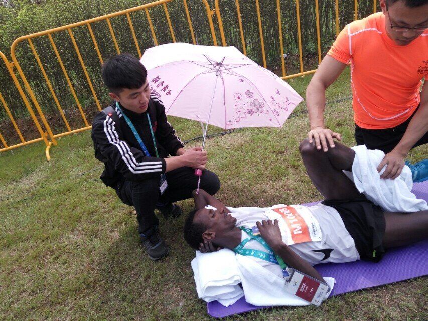 志愿者为比赛选手撑伞