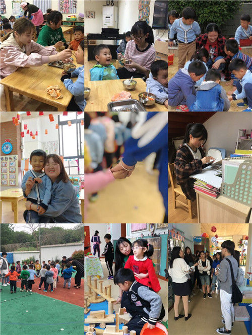 作为专业教学计划中的重要组成部分,专业见习是学生学习过程中的必要环节。见习期间,同学们经过必要的岗前培训后,即按照幼儿园的年级设置,分为大班、中班和小托班三个组,全员参与到保教工作中去。根据见习计划,同学们从接待小朋友入园开始,到盥洗、饮食、睡眠、户外活动、教学活动、游戏活动、离园等各个环节,熟悉了幼儿园的环境,较为全面地了解了幼儿园一日活动安排。大家还认真参加跟班听课,学习教学语言运用,了解教学过程和组织策略;观察记录幼儿行为,了解师生互动方法与注意事项;尝试为幼儿创设游戏环境等。