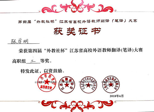 6月24日下午,第四届“外教社杯”江苏省高校外语教师翻译(笔译)大赛决赛在江苏师范大学外国语学院落下帷幕,春满四合院 基础教育系张学明老师荣获三等奖。