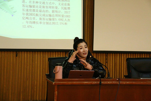 宣讲会先由曾服务于深圳航空8年的马艳老师给同学们做了航空服务类公司的培训介绍。马艳从她自身空姐做到乘务长的经历开始,从职位到面试再到职业发展规划,详细生动地向同学们展示了航空公司的各项业务以及培训要求,让同学们对航空服务类岗位有了更直观的认知。其次,由南京艺术学院吴立平教授,简明通俗地向同学们展示了会展公司的要求以及培训要求,让同学们对新媒体以及会展有了更形象具体的了解。