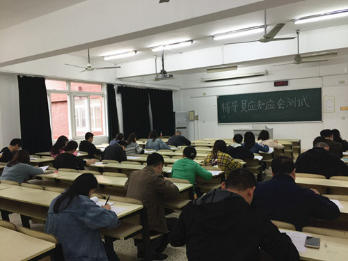 测试形式为笔试,测试范围为学生处编印最新版《学生工作干部工作手册》内容,包括党和国家关于辅导员工作相关文件,学院关于辅导员和学生工作规章制度以及辅导员公寓、资助、心理、职业规划等日常工作三部分。测试在严肃认真的气氛中进行,辅导员对本次测试非常重视,平时在辅导员群里积极切磋,考中认真自信答题。