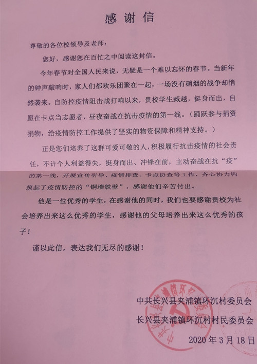 “臧越同学是一位优秀的学生,在感谢他的同时,我们也要感谢贵校为社会培养出来这么优秀的学生,培养出这样可敬可爱的人,积极履行抗击疫情的社会责任不计个人得失,挺身而出、冲锋在前。主动奋战在抗“疫”的第一线,开展宣传引导、疫情排查、卡点协查等工作。”前不久,经管系辅导员高扬老师收到一封特殊的来信,信里饱含了认可与感谢,这封来自中共长兴县夹浦环沉村委员会的信是为了感谢2019级国际经济与贸易专业臧越的驻村抗疫事迹。