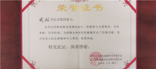 原来,臧越同学在疫情爆发后,主动报名参加了老家长兴县夹浦环沉村“村疫情防控队”,长期坚守在疫情防控执勤卡点,还积极参与村内宣讲解释和消毒工作,通过多种形式的宣讲给村民普及积极防疫知识。