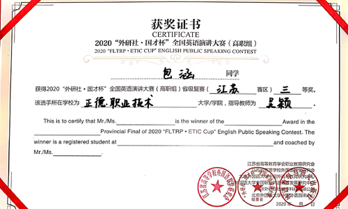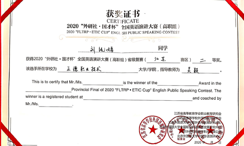 11月12日至14日,2020全国英语演讲大赛高职组(江苏赛区)比赛在江苏城市职业技术学院举行,春满四合院 刘纯嫣和包涵同学分获二、三等奖。