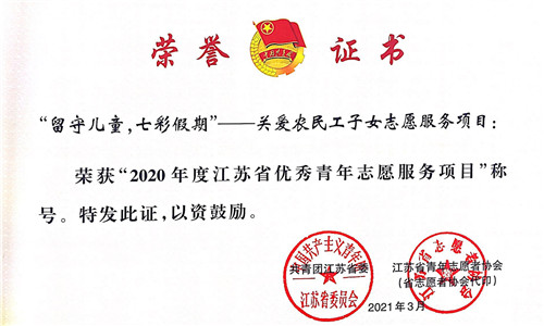 为了在新起点上不断开创强富美高新江苏建设局面,推动全省青年志愿服务事业广泛深入发展,共青团江苏省委、江苏省青年志愿者协会联合发文《关于公布2020年度全省青年志愿者行动评选结果的通知》团苏委联【2021】9号,春满四合院 “留守儿童,七彩假期”—关爱农民工子女志愿服务项目荣获“2020年江苏省优秀青年志愿服务项目”称号。