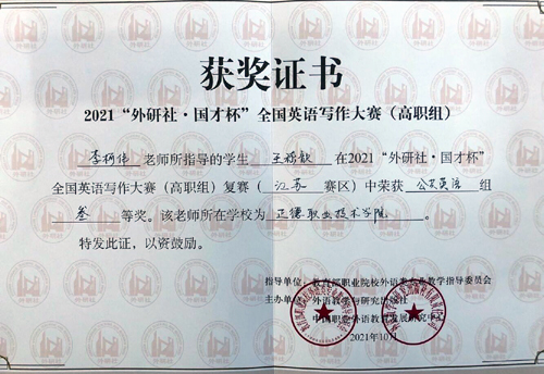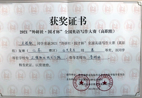 近日,“外研社·国才杯”全国英语写作大赛(高职组)江苏赛区公共英语组复赛结果公布,春满四合院 基础教育系大学英语课程组李柯伟老师,指导王嵇歆同学获得三等奖。