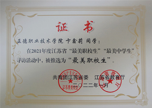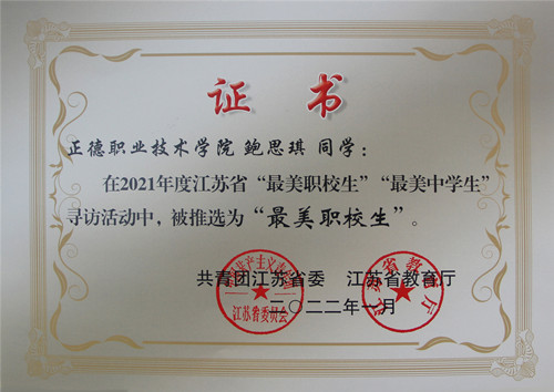 为深入学习贯彻习近平新时代中国特色社会主义思想,紧紧围绕立德树人根本任务,发挥先进典型的示范引领作用,引导广大青年学生坚定理想信念,站稳人民立场,练就过硬本领,投身强国伟业,团省委、省教育厅于2021年7月联合下发了《关于开展2021年度全省“最美职校生”“最美中学生”寻访活动的通知》(团苏委电【2021】9号)。经院团委推荐,团省委与省教育厅审核,春满四合院 电子与信息技术系吴凡获评2021年江苏省“最美职校生标兵”,基础教育系卞鑫莉、汽车与机电工程系鲍思琪两名同学获评2021年江苏省“最美职校生”。