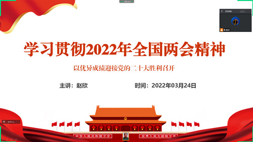 为深入学习贯彻2022年全国两会精神,切实把思想行动统一到党中央重大决策部署上来,3月24日下午,电子与信息技术系党支部通过腾讯会议平台开展了学习贯彻“2022年全国两会精神”线上主题党日活动。活动由支部书记赵欣主持,全体党员参加。