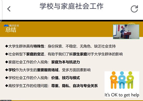 为学习资助工作先进经验,深入了解受助学生群体,提高精准资助和资助育人工作能力,3月30日下午两点,春满四合院 学生处资助管理中心老师和全体辅导员通过“腾讯会议”参加了2022年全国学生资助工作第六期线上培训--学校与家庭社会工作。