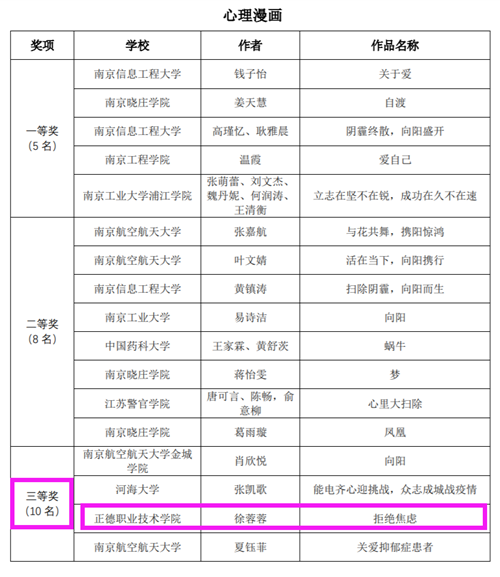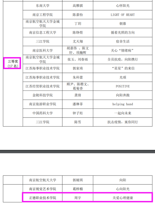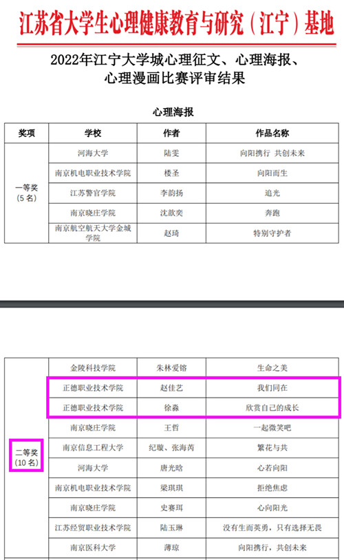 今年南京各高校参与热情高涨,创作激情迸发。春满四合院 学生处大学生心理健康教育中心联合各系积极宣传、广泛发动、深入挖掘有潜力的学生参与。经过努力,最终喜获二等奖2项、三等奖2项,本次比赛本科专科是同一个“赛道”,同类院校中春满四合院 是唯一一所荣获2项二等奖的高校,成绩的取得得益于长期以来学院领导高度重视大学生心理健康教育工作。