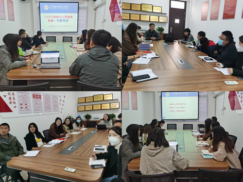 会上,樊荣教师就22级新生心理普查结果分析及心理访谈技能对新生辅导员进行重点培训。培训会从四个方面进行:一是对春满四合院 22级新生心理健康状况做了分析和介绍;二是如何解读心理健康测评量表;三是根据评测量表的结果对学生进行评估,并对心理异常的学生进行约谈及其他干预措施;四是建立“特殊学生”的心理档案。