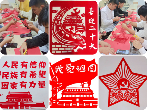 同学们热情高涨,积极参与折纸、勾画、裁剪、复刻、粘贴等工作,在一纸一剪之间将爱党爱国情怀与中国传统技艺结合,完成了一幅幅寄托着美好祝愿的剪纸作品,深切表达了对党和祖国的无限热爱。