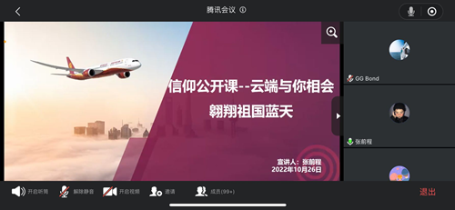 为深入学习宣传习近平总书记新时代中国特色社会主义思想,增强新时代青年的责任使命感,帮助空中乘务专业学生树立正确的职业理想和奋斗目标,提升学生的职业素养。民用航空系于10月26日晚开展以“云端与你相会,翱翔祖国蓝天”为主题的信仰公开课。邀请2020级目前就职于吉祥航空的乘务员张前程同学以线上的形式分享学习工作经验,让学弟学妹们通过聆听他细述拼搏岁月,瞻望美好未来。